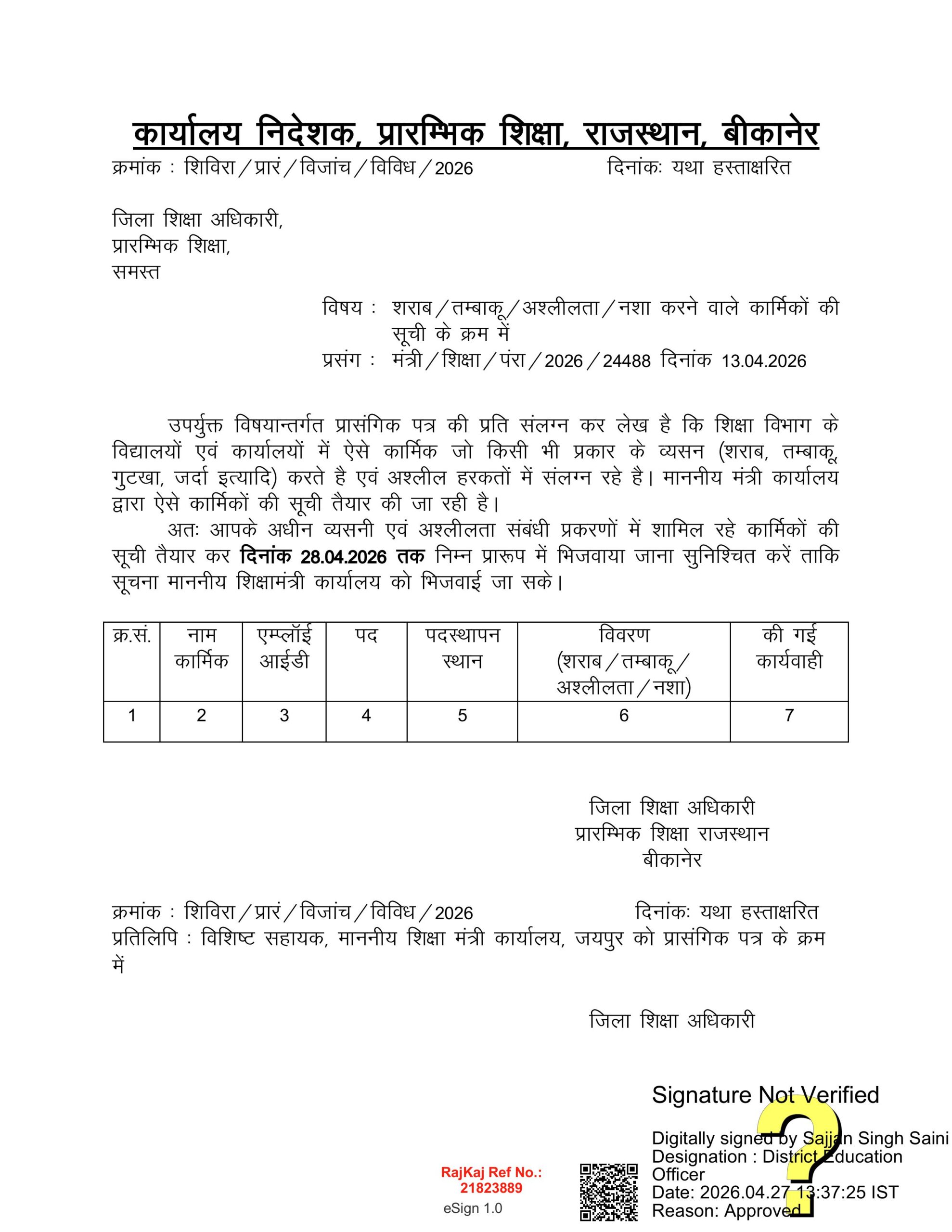 जारी निर्देशों के अनुसार, सभी जिला शिक्षा अधिकारियों को अपने अधीन आने वाले स्कूलों और कार्यालयों से ऐसे कार्मिकों की विस्तृत सूची तैयार करने को कहा गया है। यह सूची एक निर्धारित प्रारूप में भेजी जानी अनिवार्य है, जिसमें कर्मचारी का नाम, उसकी एम्प्लॉई आईडी, पदस्थापन स्थान (स्कूल या कार्यालय का नाम), नशे या अनुचित गतिविधि का विशिष्ट प्रकार और अब तक उसके खिलाफ की गई विभागीय कार्रवाई का पूरा विवरण देना होगा।