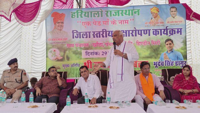 करौली जिला प्रभारी मंत्री जवाहर सिंह बेढम के द्वारा हिण्डौन पंचायत समिति की ग्राम पंचायत खरैटा में हरयाळो राजस्थान के तहत जिला स्तरीय वृक्षारोपण कार्यक्रम आयोजित किया गया। हरयाळो राजस्थान के तहत एक पेड़ माँ के नाम अभियान के अंतर्गत वृहद स्तर पर पौधारोपण किया गया। कार्यक्रम के दौरान जिला प्रभारी मंत्री ने पौधारोपण कर पर्यावरण संरक्षण का संदेश आमजन को दिया। इस दौरान जिला प्रभारी मंत्री ने कहा कि प्रधानमंत्री के आह्वान पर एक पेड़ माँ के नाम अभियान से प्रेरणा लेकर मुख्यमंत्री के नेतृत्व में राजस्थान सरकार हरियालो राजस्थान वृहद वृक्षारोपण कार्यक्रम के माध्यम से प्रदेश को हरा-भरा बनाने के संकल्प को साकार करने की दिशा में अग्रसर है। पिछले वर्ष 7 करोड़ के लक्ष्य के विरूद्ध हमारी सरकार ने जन सहभागिता के माध्यम से 7.25 करोड पौधे रोपित किये थे। मंत्री ने कहा कि भारतीय संस्कृति में पेड़ों की पूजा की जाती है। उन्हें भगवान माना जाता है पेड़ों से हमें ऑक्सीजन, जड़ी-बूटी, फल-फुल, छाया, स्वच्छ वातावरण और अच्छी बारिश मिलती है। इसलिए हमारी संस्कृति में प्राचीन समय से ही अधिक से अधिक पेड़ लगाने की परम्परा रही है।
