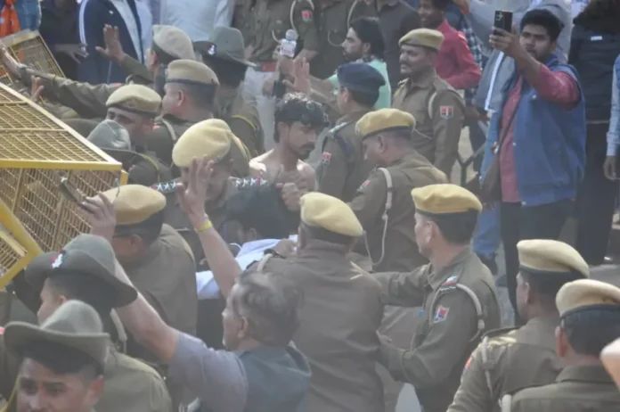 15 मिनट तक चली मशक्कत में लोगों ने पुलिस के सुरक्षा घेरे को तोड़ने का प्रयास किया और भीड़ ने पहले ही प्रयास में एक छोर पर लोहे के बेरिकेट्स को गिरा दिया। वहीं भीड़ को रोकने के लिये पुलिस ने हल्का बल प्रयोग कर सुरक्षा घेरे को बहाल किया। इस दौरान धरने पर पहुंचे लोग कलक्टर को बाहर बुलाने की मांग करने लगे। धरने पर पहुंचे लोग कलक्टर को बाहर बुलाने की मांग करने लगे।