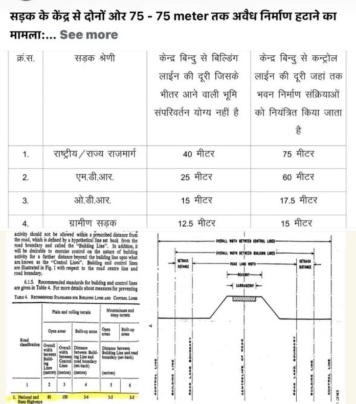 स्टेट हाईवे: राज्य राजमार्गों के लिए भी सड़क के मध्य से 40 मीटर से लेकर 75 मीटर तक की दूरी बनाए रखना अनिवार्य है। व्यावसायिक भवनों के लिए यह नियम और भी कड़ा है।