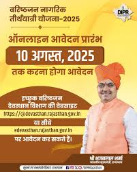 प्रदेश में वरिष्ठजन नागरिक तीर्थयात्री योजना-2025 के लिए देवस्थान विभाग ने ऑनलाइन आवेदन की प्रक्रिया प्रारंभ कर दी है। इस ऑनलाइन प्रक्रिया को देवस्थान मंत्री जोराराम कुमावत ने देवस्थान विभाग की वेबसाइट https://devasthan.rajasthan.gov.in पर बटन दबाकर पोर्टल का शुभारंभ किया। इस अवसर पर सचिव देवस्थान और कार्मिक विभाग के के पाठक, उप शासन सचिव आलोक सैनी और सहायक आयुक्त देवस्थान रतनलाल योगी सहित विभाग के वरिष्ठ अधिकारी उपस्थित थे।